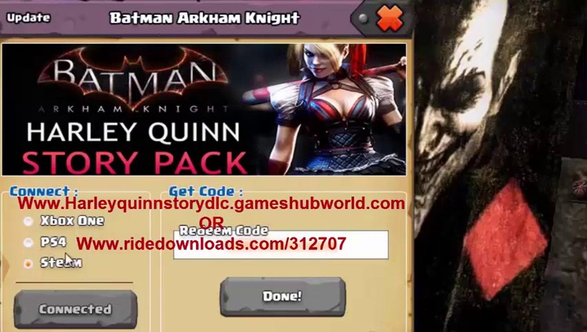 If you are a pc userthen select pc in batman arkham knight harley quinn story pack dlc codes generatorwhen you have your codelogon to your steam client and then navigate to the game menufinally choose activate a product on steamthen enter your steam redeem codeyour batman arkham knight harley quinn story pack dlc download will start instantly. Onlyatjmart 1 year ago 1. Jun 23 2015 at 1014am.